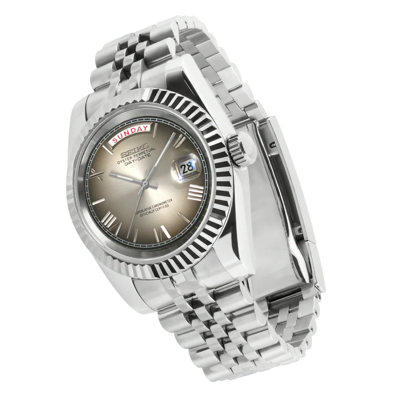The Mod Day-Date Reimagined embodies classic prestige reshaped through modern craftsmanship. Built from 904L stainless steel, its 40 mm case and fluted bezel echo timeless sophistication while expressing a new kind of confidence — refined yet unmistakably contemporary.