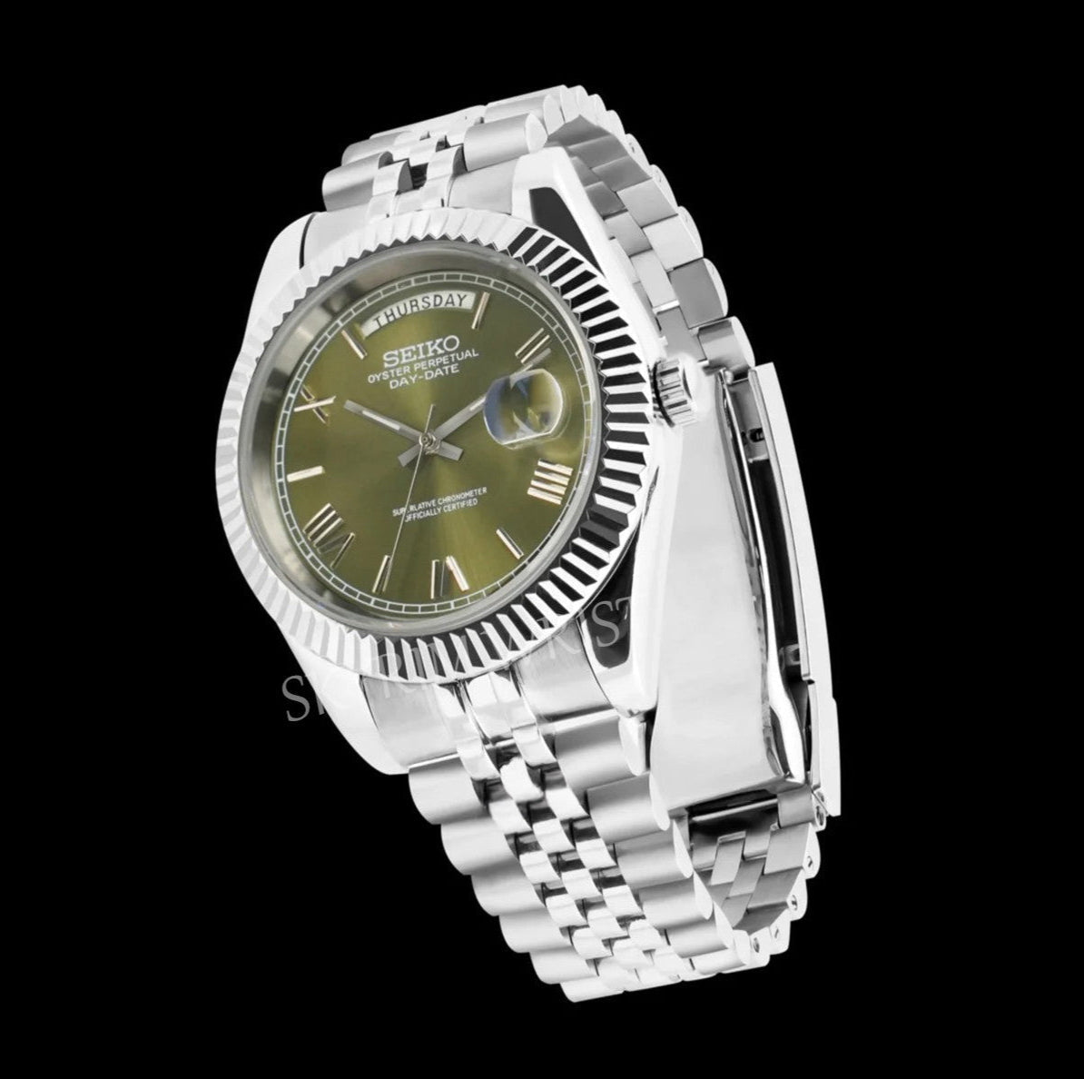The Mod Day-Date Reimagined embodies classic prestige reshaped through modern craftsmanship. Built from 904L stainless steel, its 40 mm case and fluted bezel echo timeless sophistication while expressing a new kind of confidence — refined yet unmistakably contemporary.