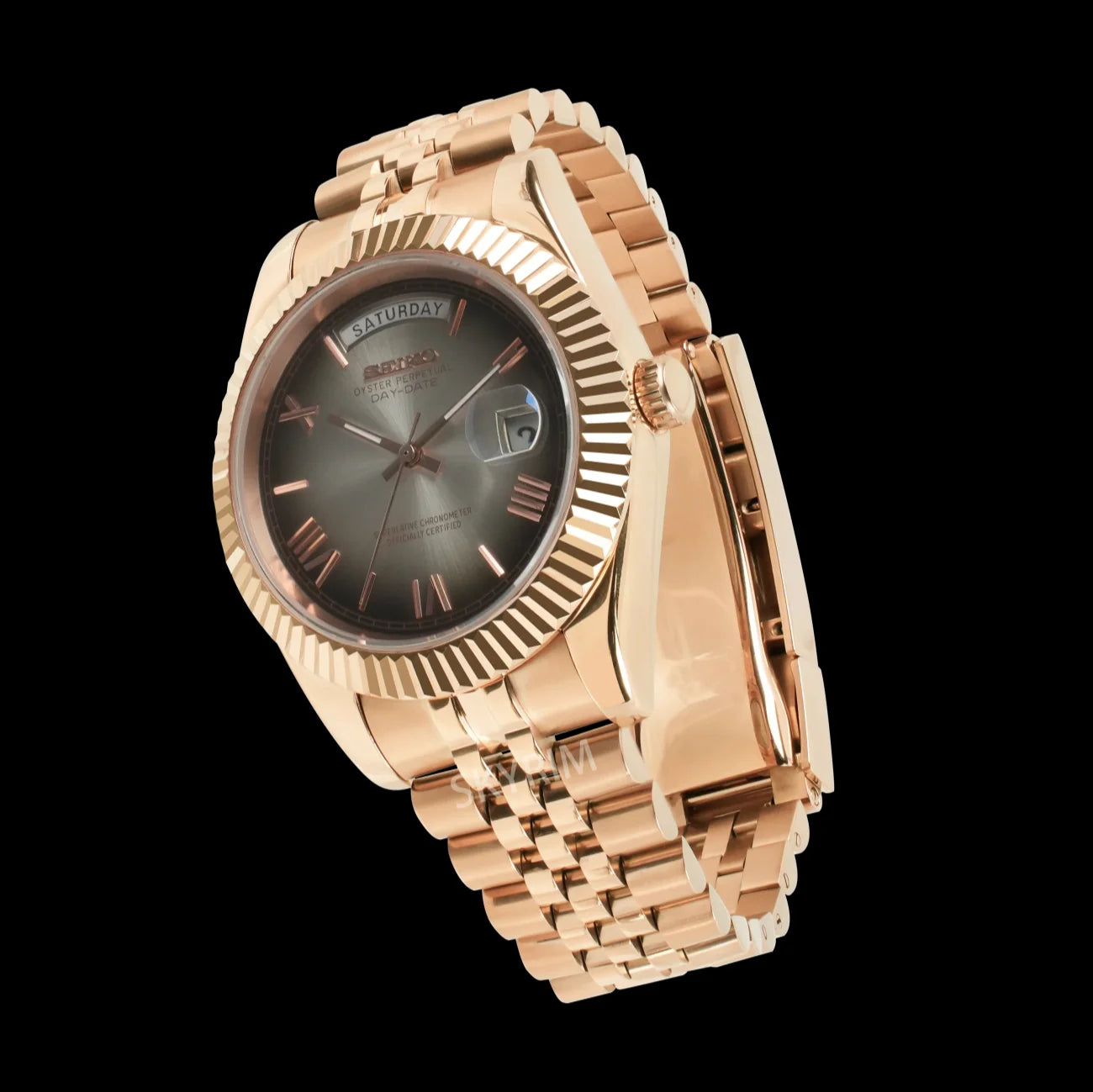 The Mod Day-Date Reimagined embodies classic prestige reshaped through modern craftsmanship. Built from 904L stainless steel, its 40 mm case and fluted bezel echo timeless sophistication while expressing a new kind of confidence — refined yet unmistakably contemporary.