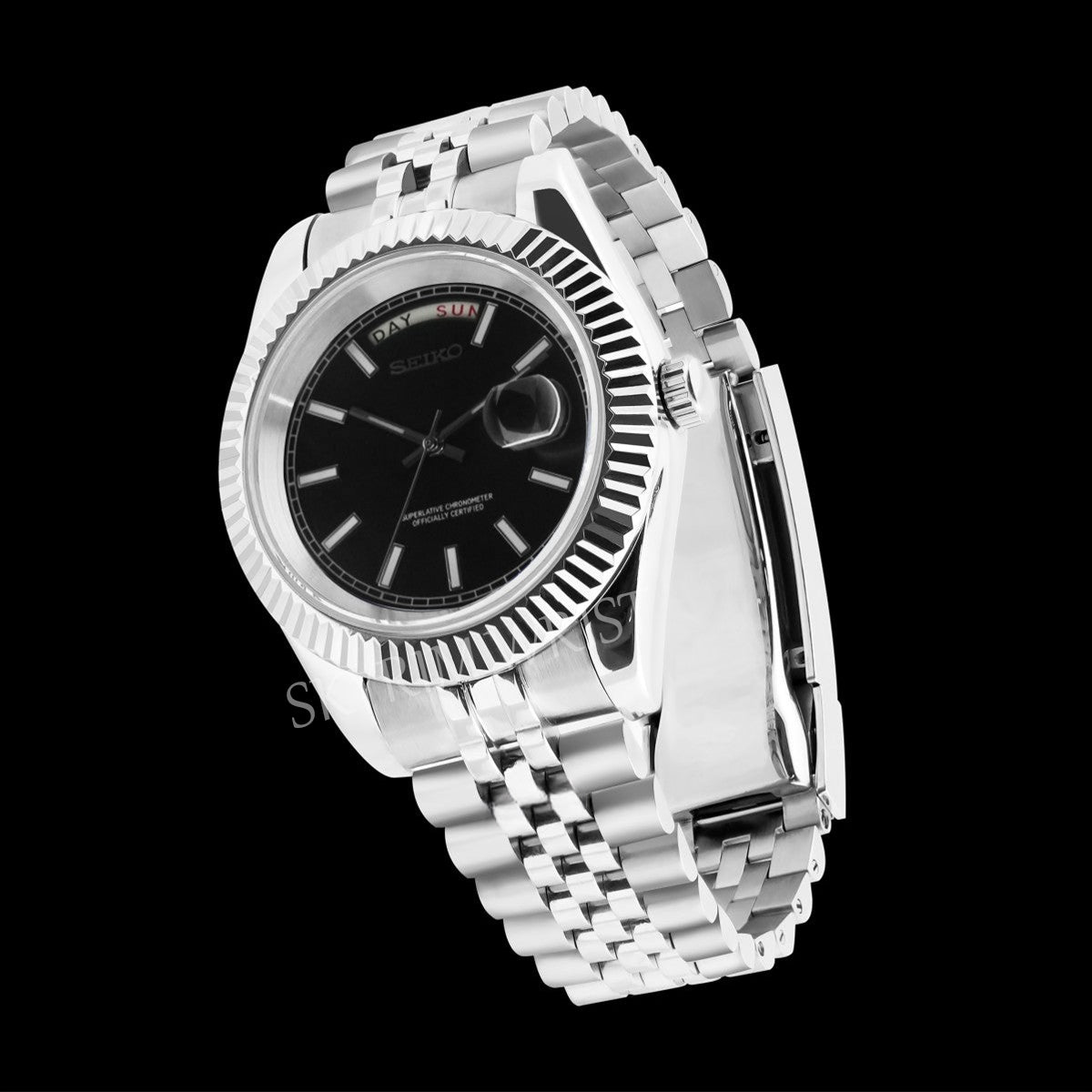 The Mod Day-Date Reimagined embodies classic prestige reshaped through modern craftsmanship. Built from 904L stainless steel, its 40 mm case and fluted bezel echo timeless sophistication while expressing a new kind of confidence — refined yet unmistakably contemporary.