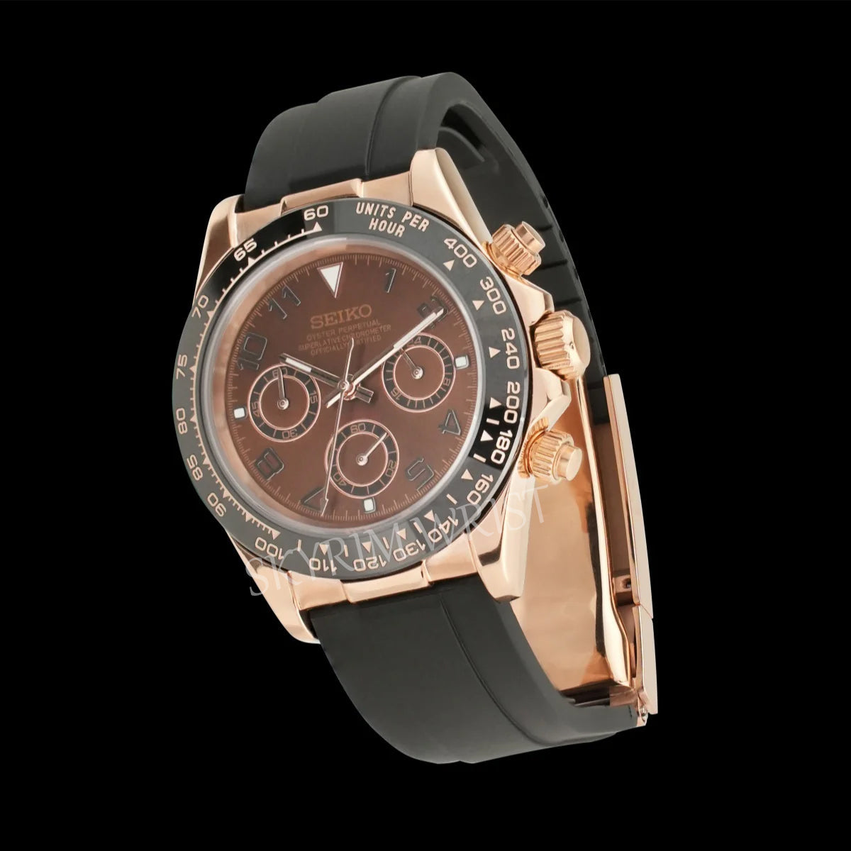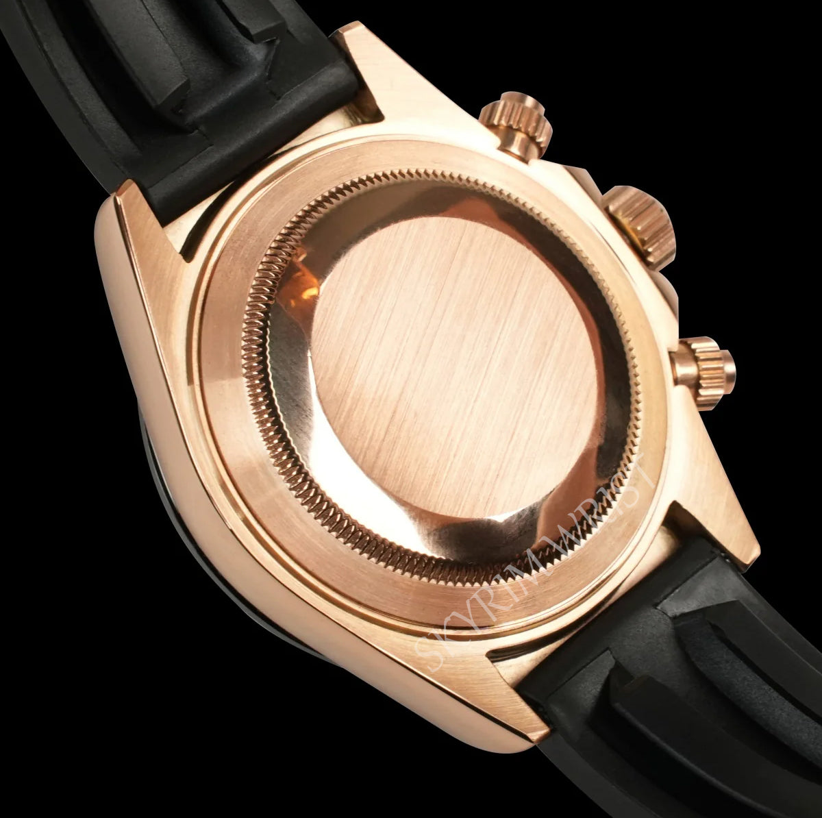 Inspired by the legendary chronograph design and reimagined through modern craftsmanship, the Mod Daytona – Rubber Edition captures performance, comfort, and precision in perfect balance. Its 40 mm 904L stainless-steel case is sculpted for durability and presence, while the rubber strap brings a contemporary, athletic touch — engineered for comfort and endurance.
