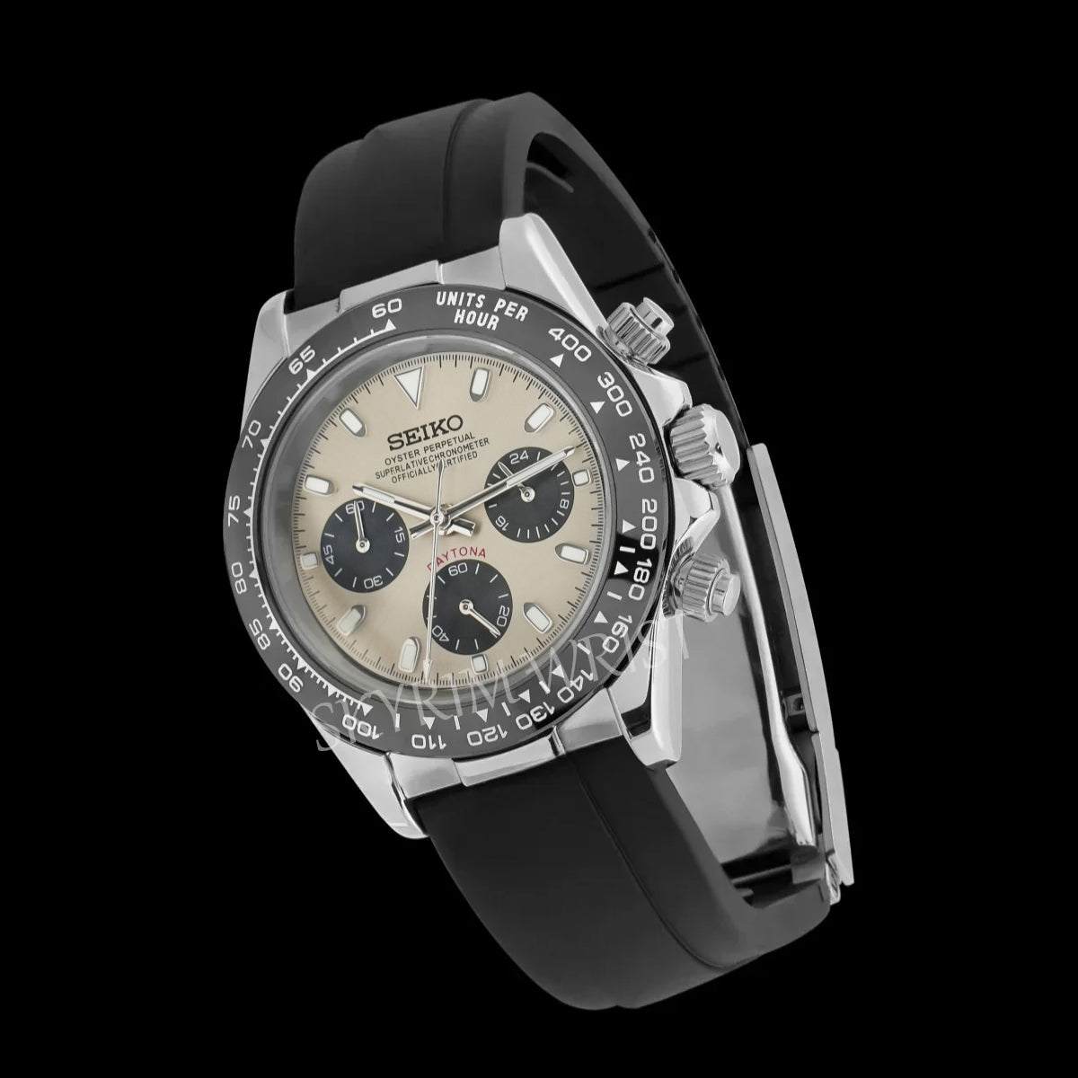 Inspired by the legendary chronograph design and reimagined through modern craftsmanship, the Mod Daytona – Rubber Edition captures performance, comfort, and precision in perfect balance. Its 40 mm 904L stainless-steel case is sculpted for durability and presence, while the rubber strap brings a contemporary, athletic touch — engineered for comfort and endurance.