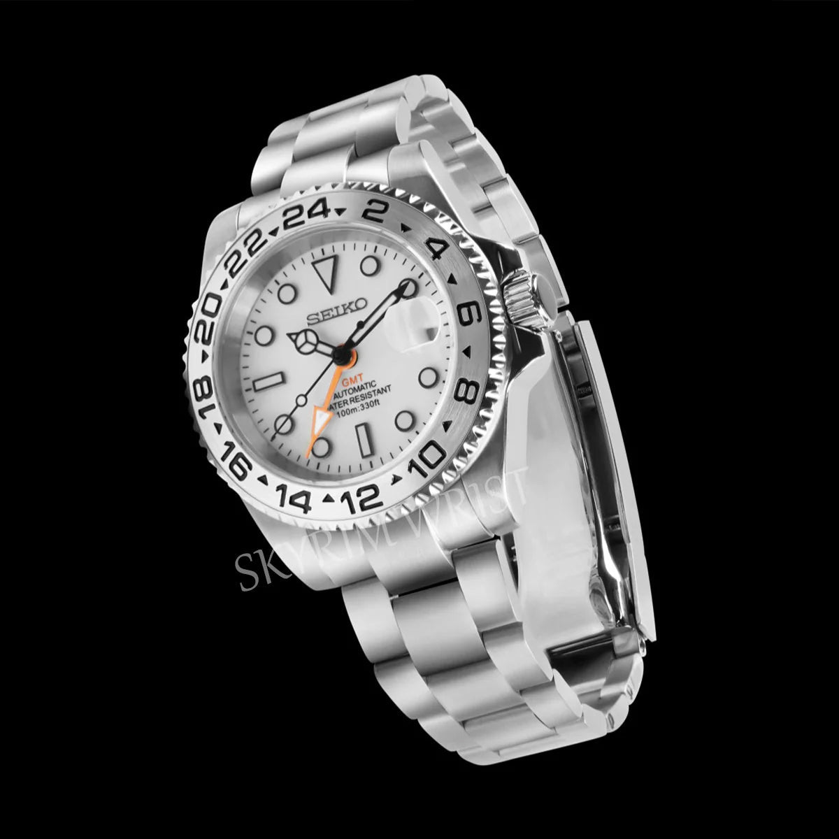 Its 40 mm 904L stainless-steel case and ceramic bezel deliver enduring strength and elegance, while the Seiko NH34 automatic movement offers seamless dual-time tracking for travelers and professionals alike. Beneath the sapphire crystal, C3 luminous hands ensure legibility through day and night.
