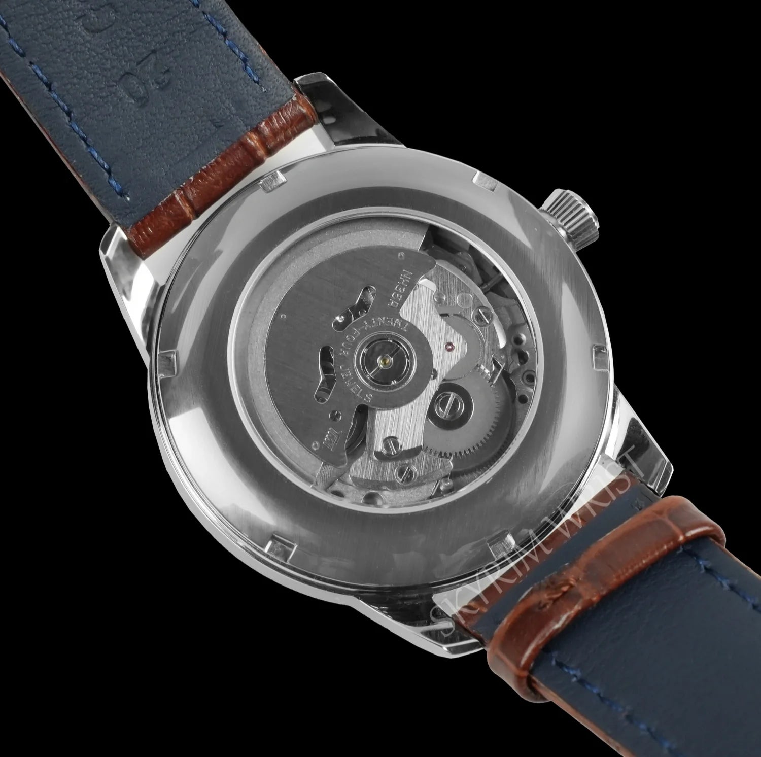 At its heart beats the Seiko NH35 automatic movement, trusted for its accuracy and balance — hackable, hand-windable, and built for precision. Beneath the sapphire crystal, the polished hands and markers catch light like morning frost, reflecting calm strength in every detail.