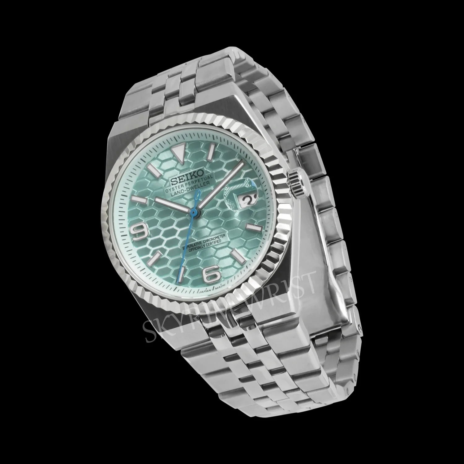 Driven by the Seiko NH35 automatic movement, it offers dependable precision — hackable, hand-windable, and crafted for reliability. Beneath its sapphire crystal, every detail is designed with purpose, from the bold architecture of the case to the secure Land-Dweller bracelet built for lasting comfort.