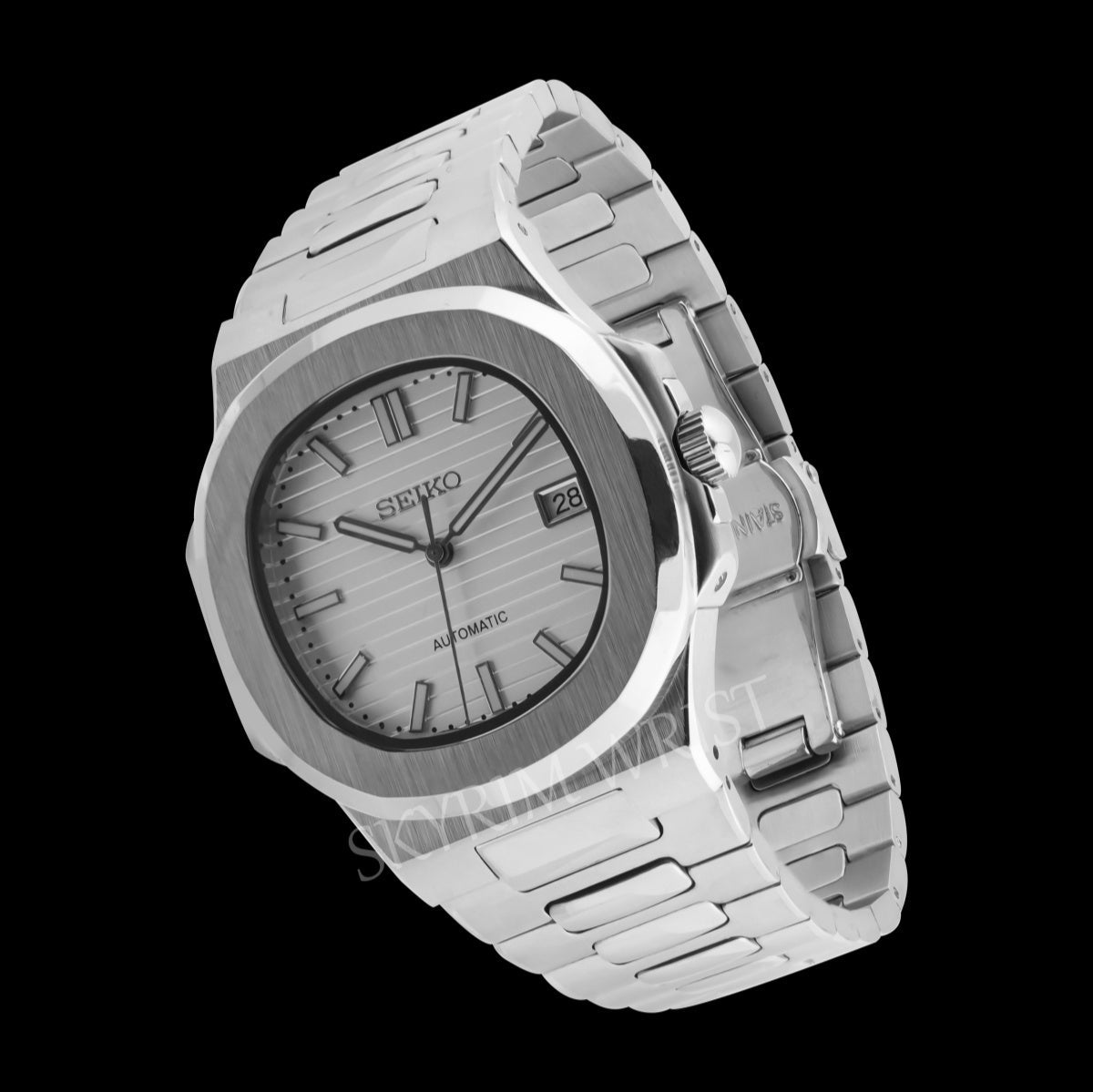 Crafted from 904L stainless steel, the case and integrated Nautilus-style bracelet form a seamless silhouette that moves fluidly with the wrist. Driven by the Seiko NH35 automatic movement, it delivers precise, reliable performance — hackable, hand-windable, and built to last.