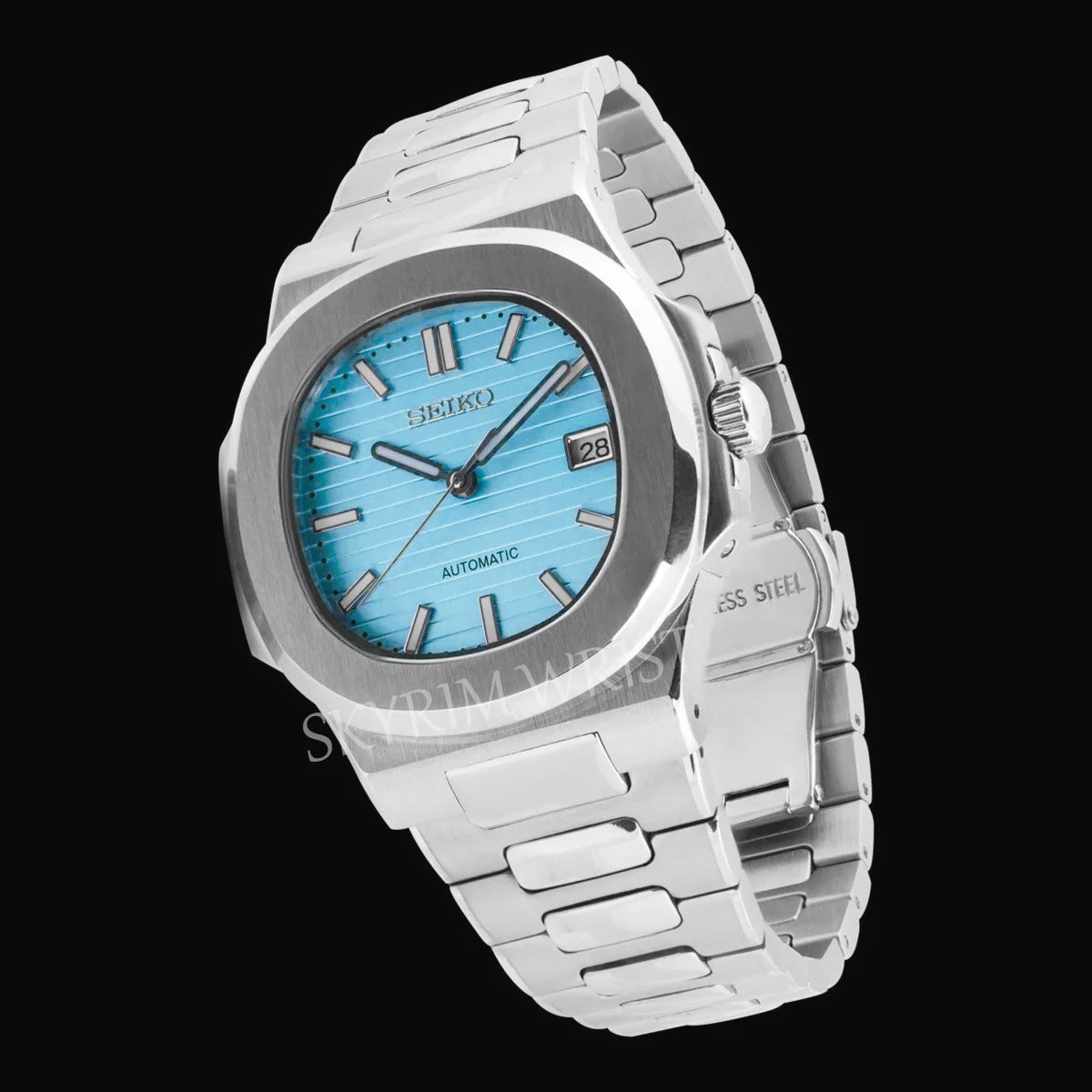 Crafted from 904L stainless steel, the case and integrated Nautilus-style bracelet form a seamless silhouette that moves fluidly with the wrist. Driven by the Seiko NH35 automatic movement, it delivers precise, reliable performance — hackable, hand-windable, and built to last.