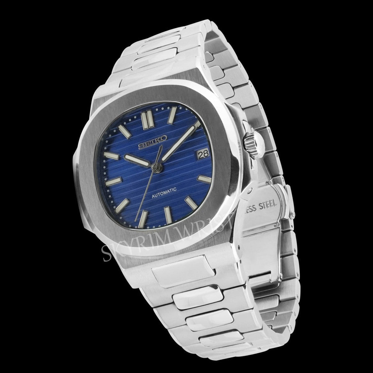 Crafted from 904L stainless steel, the case and integrated Nautilus-style bracelet form a seamless silhouette that moves fluidly with the wrist. Driven by the Seiko NH35 automatic movement, it delivers precise, reliable performance — hackable, hand-windable, and built to last.