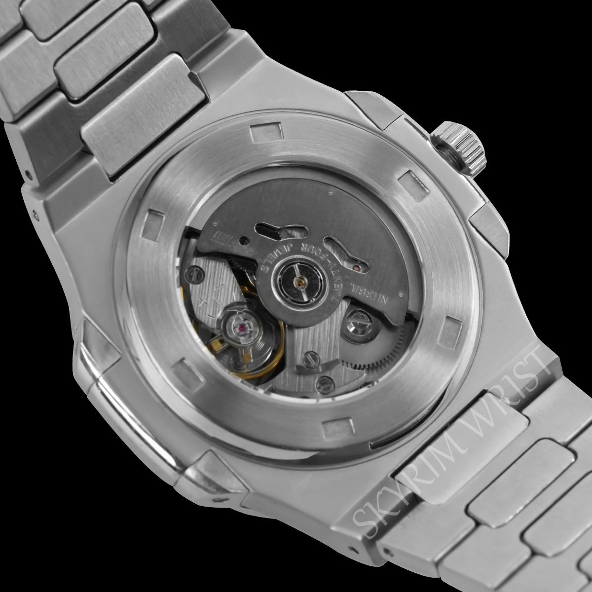 Crafted from 904L stainless steel, the case and integrated Nautilus-style bracelet form a seamless silhouette that moves fluidly with the wrist. Driven by the Seiko NH35 automatic movement, it delivers precise, reliable performance — hackable, hand-windable, and built to last.