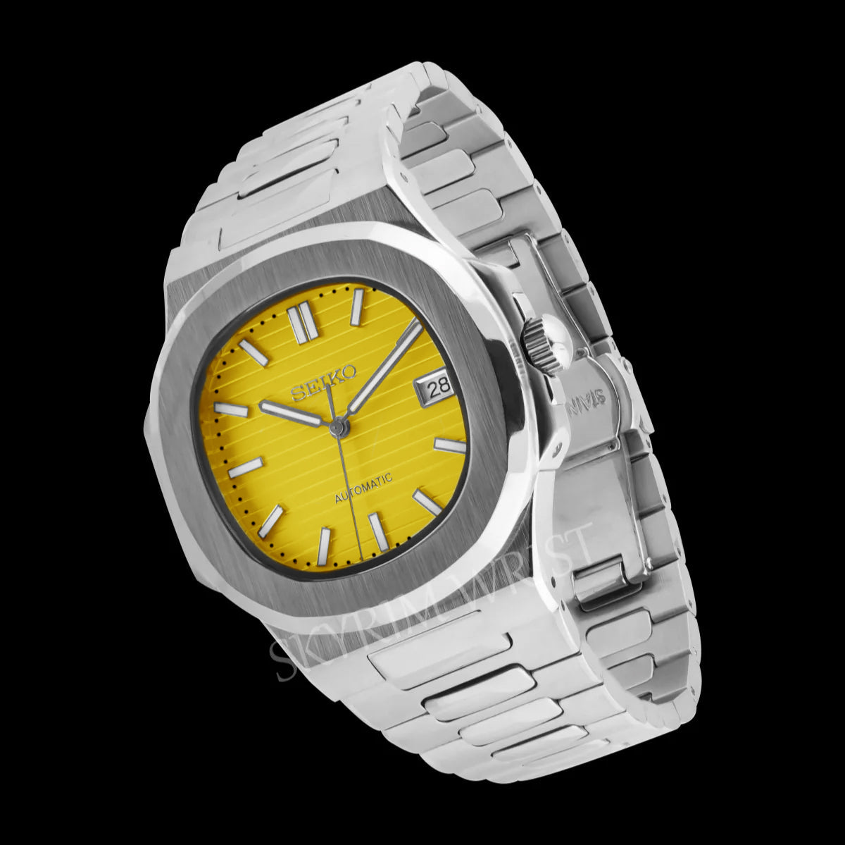 Crafted from 904L stainless steel, the case and integrated Nautilus-style bracelet form a seamless silhouette that moves fluidly with the wrist. Driven by the Seiko NH35 automatic movement, it delivers precise, reliable performance — hackable, hand-windable, and built to last.