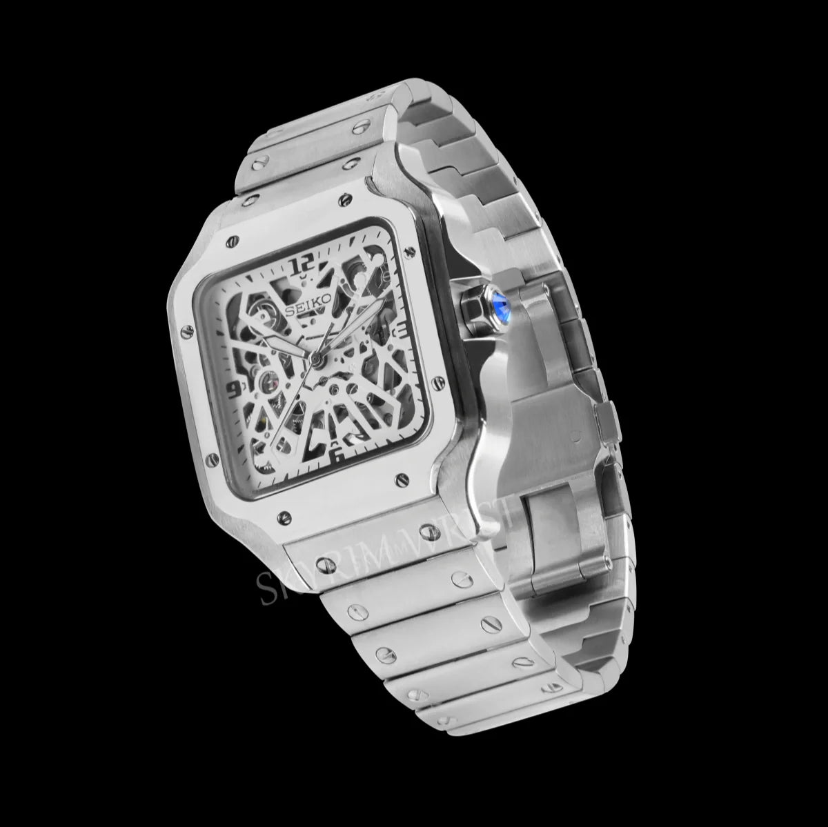 The Mod Santos Skeleton reveals the artistry within — every bridge, every gear, every heartbeat of the Seiko NH70 automatic movement on full display. This is where craftsmanship becomes architecture, and time becomes design.