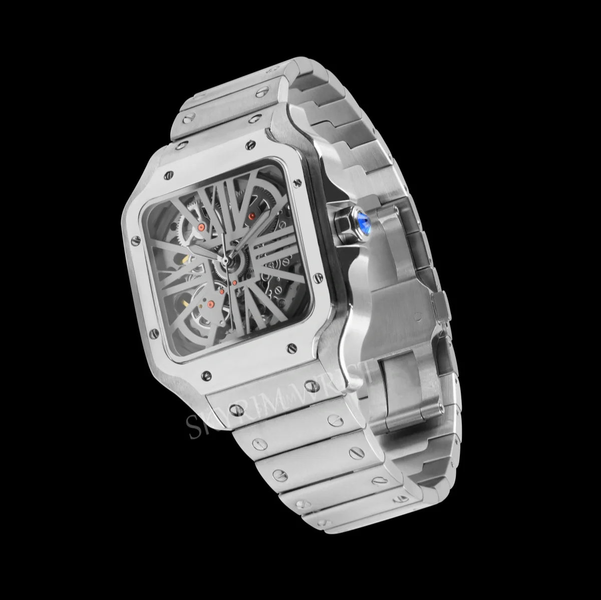 The Mod Santos Skeleton reveals the artistry within — every bridge, every gear, every heartbeat of the Seiko NH70 automatic movement on full display. This is where craftsmanship becomes architecture, and time becomes design.