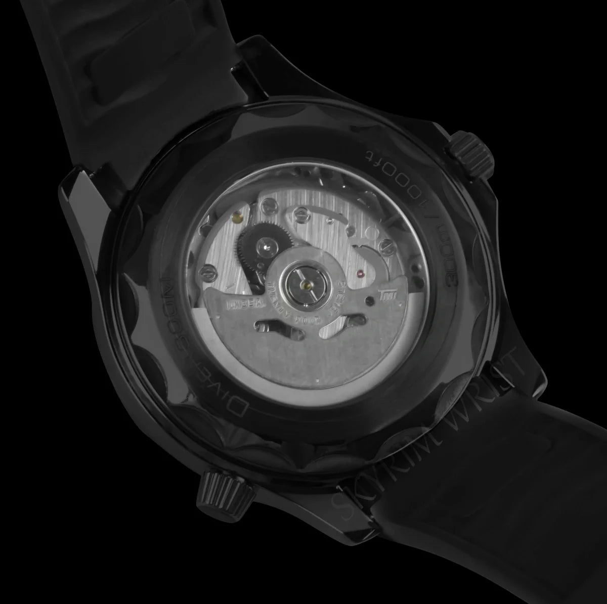 The 42 mm 904L stainless-steel case frames a ceramic bezel, engineered for clarity and endurance. Powered by the Seiko NH35 automatic movement — hackable, hand-windable, and renowned for reliability — it delivers timekeeping you can trust beneath any surface.