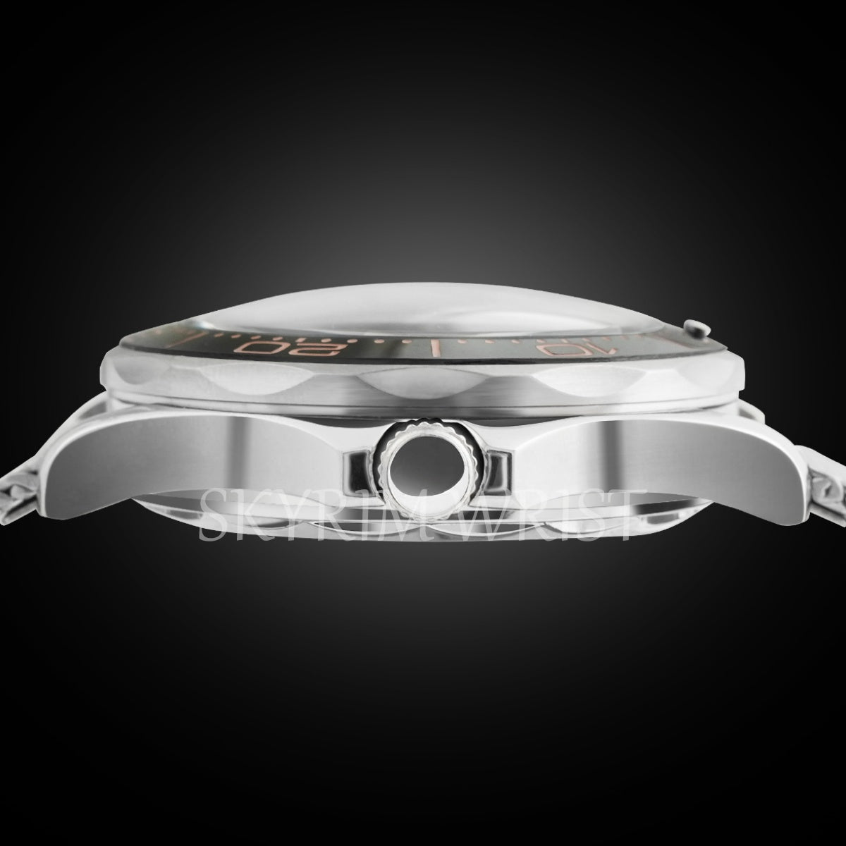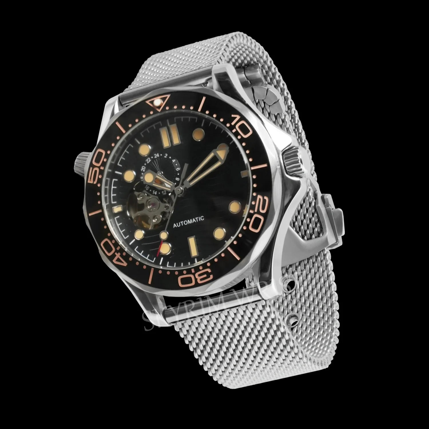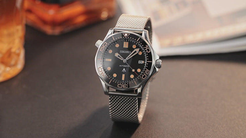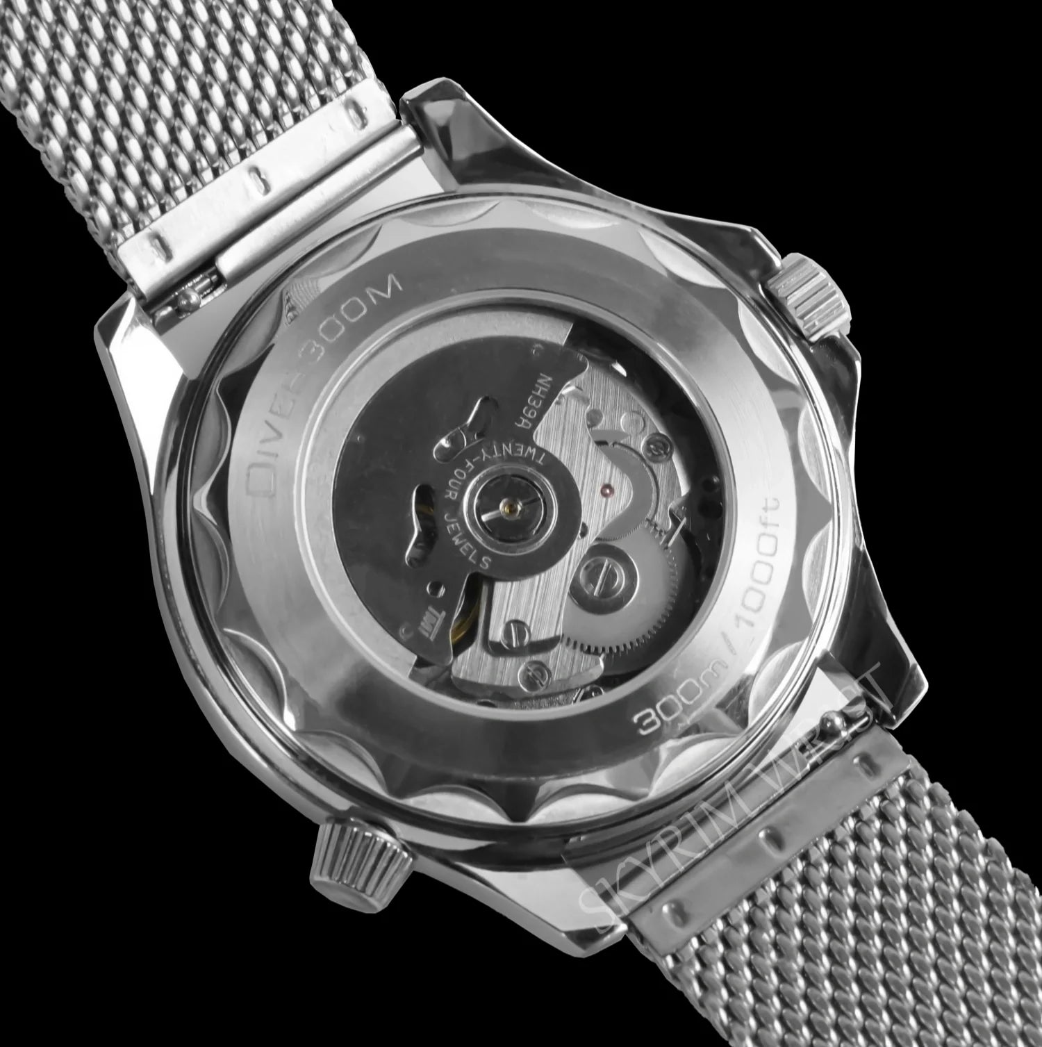 Crafted from 904L stainless steel, its 42 mm case and ceramic bezel embody endurance and refined detail. The mesh bracelet adds balance — lightweight, breathable, and timelessly elegant. Beneath the sapphire crystal, the Seiko NH39 automatic movement beats with quiet accuracy — hackable, hand-windable, and built for precision.