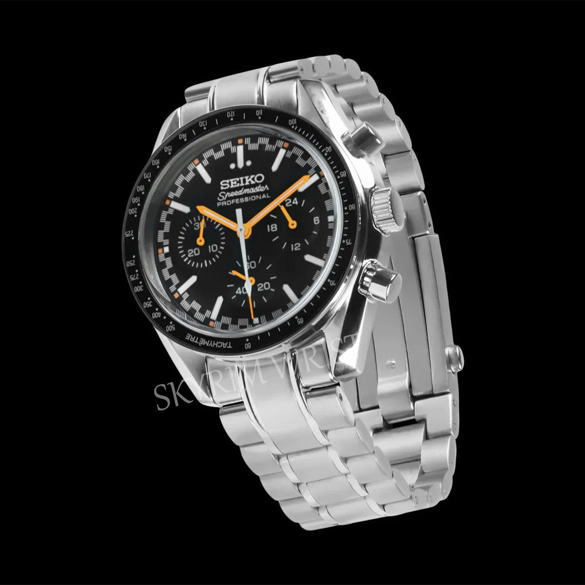 Its 42 mm case, crafted from 904L stainless steel, houses the Seiko VK63 meca-quartz movement, merging the tactile rhythm of mechanical pushers with the accuracy of quartz timekeeping. The Speedmaster-style bracelet flows naturally from case to wrist, offering strength and comfort in equal measure.